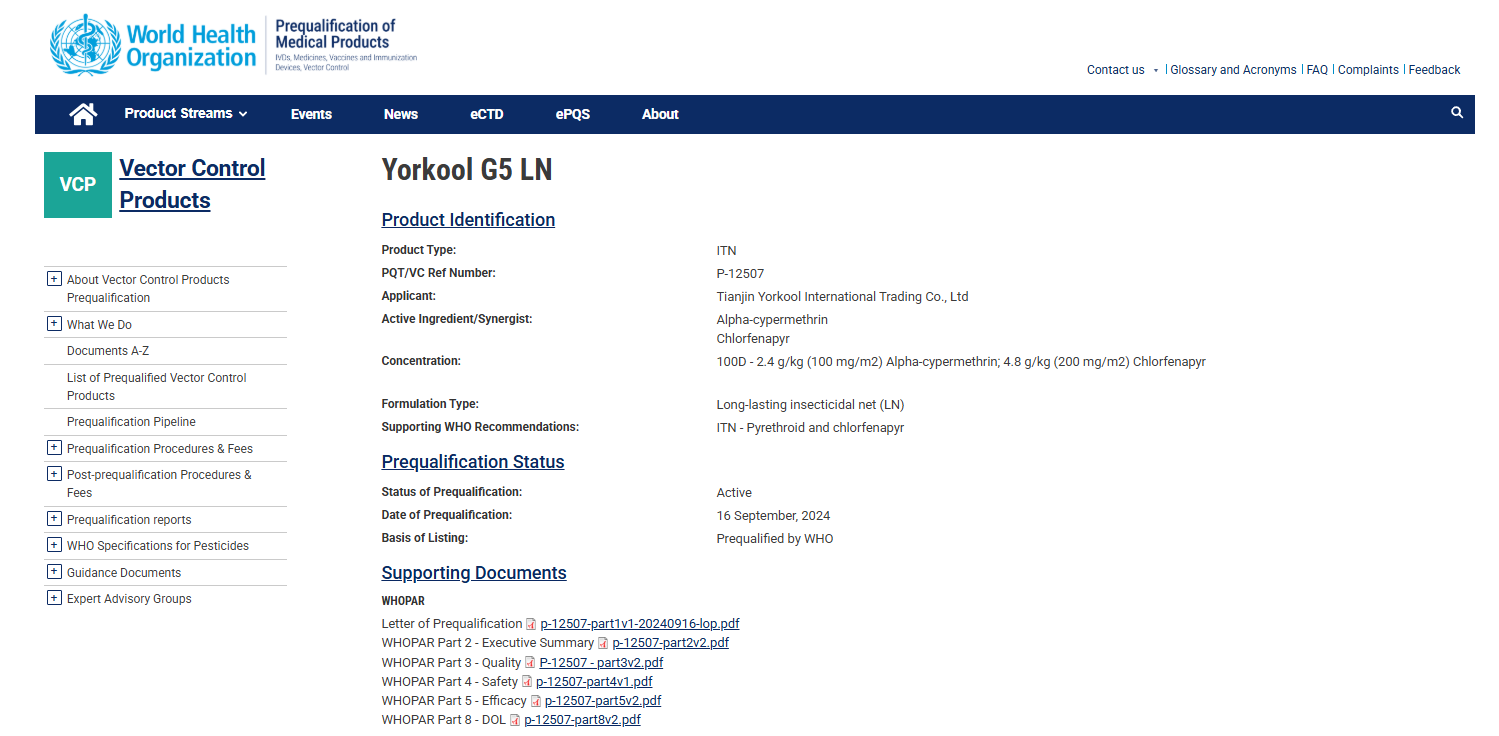 According to the prequalification letter issued by the WHO Prequalification Unit (PQT-VCP) on September 16, 2024 (PQ Number: P-12507, Application Number: PQ-VCP-2024-0006), the Yorkool G5 LN long-lasting insecticidal net was confirmed to comply with the norms and standards for insecticide-treated nets (ITNs) recommended by WHO after a comprehensive assessment, and in principle, it can be procured by the United Nations and other international agencies and countries.
