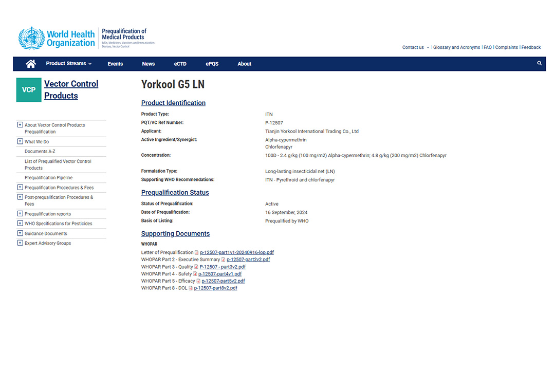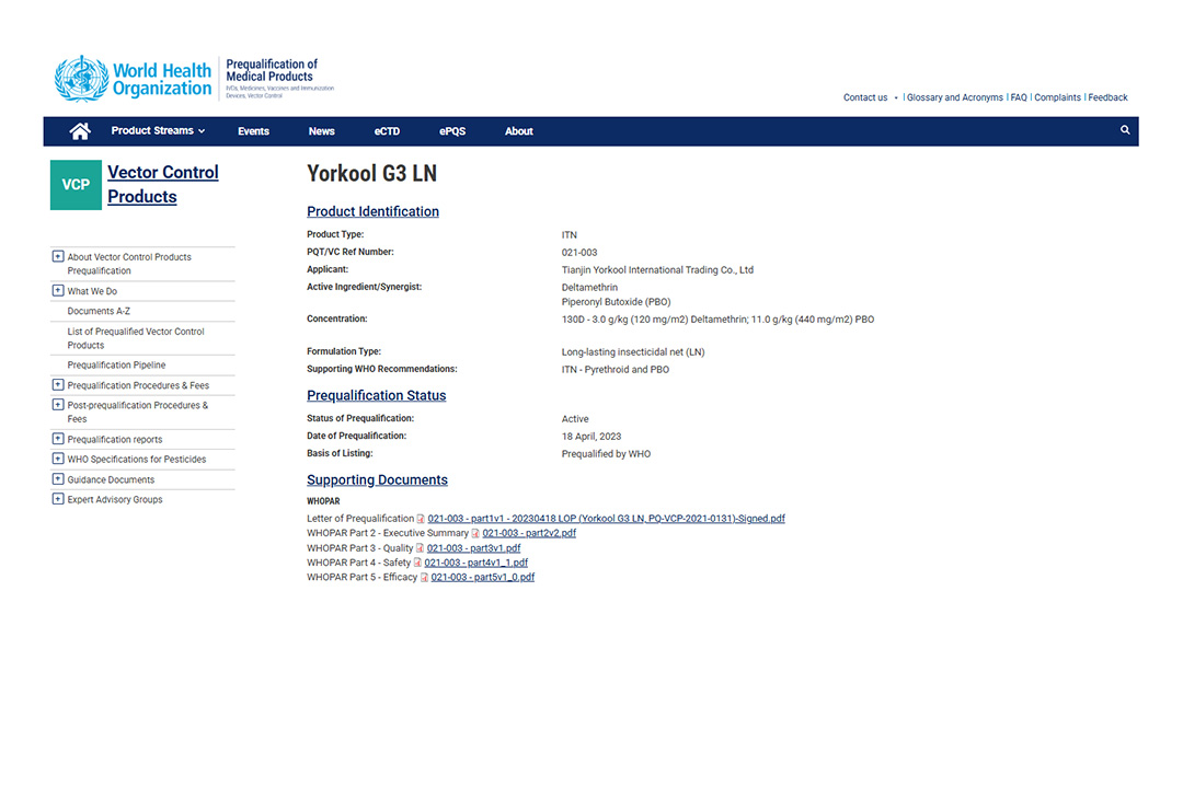 Warm Congratulations! Yorkool G3 LN Long-Lasting Insecticidal Net Successfully Passes WHO Prequalification and Is Listed in the PQ List